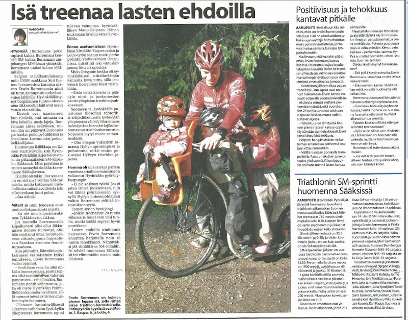 Lahtisen Miian loppuaika oli 1.10.18. Kolmantena miehenä matkaan lähtenyt ja alkumatkasta toisena potkinut Ilkka Sadinmäki ajoi varmaan jonkin risteyksen pitkäksi koska hän oli Joonaksen edellä mutta 1.20 min startin jälkeen häntä ei vielä näkynyt maalissa kun kiirehdimme jo rantaan katsomaan triathlonin starttia.