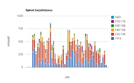Alla olevasta kuvasta nähdään millä sykealueilla harjoittelu pyöri viikoittain.