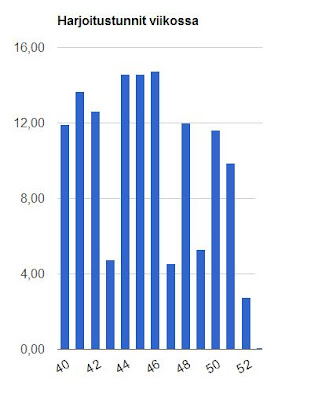 Olen yllättävän ahkerasti jaksanut käydä aamulenkeillä. Nämä rauhalliset aamulenkit lohkaiset valtaosan harjoittelusta. Viikoilla 49-51 iski motivaation puute ja en tehnyt niitä harjoituksia mitä olisi pitänyt.
